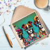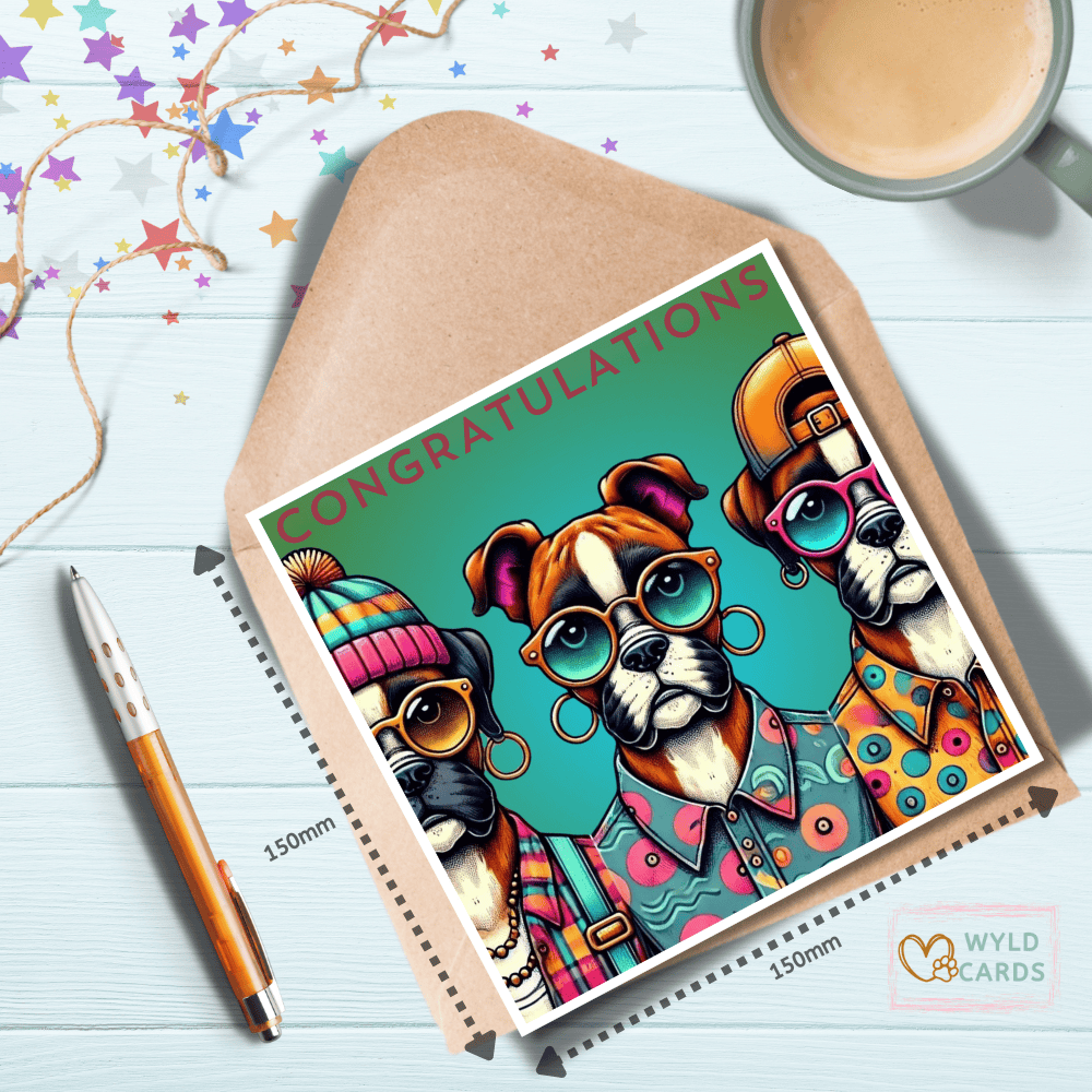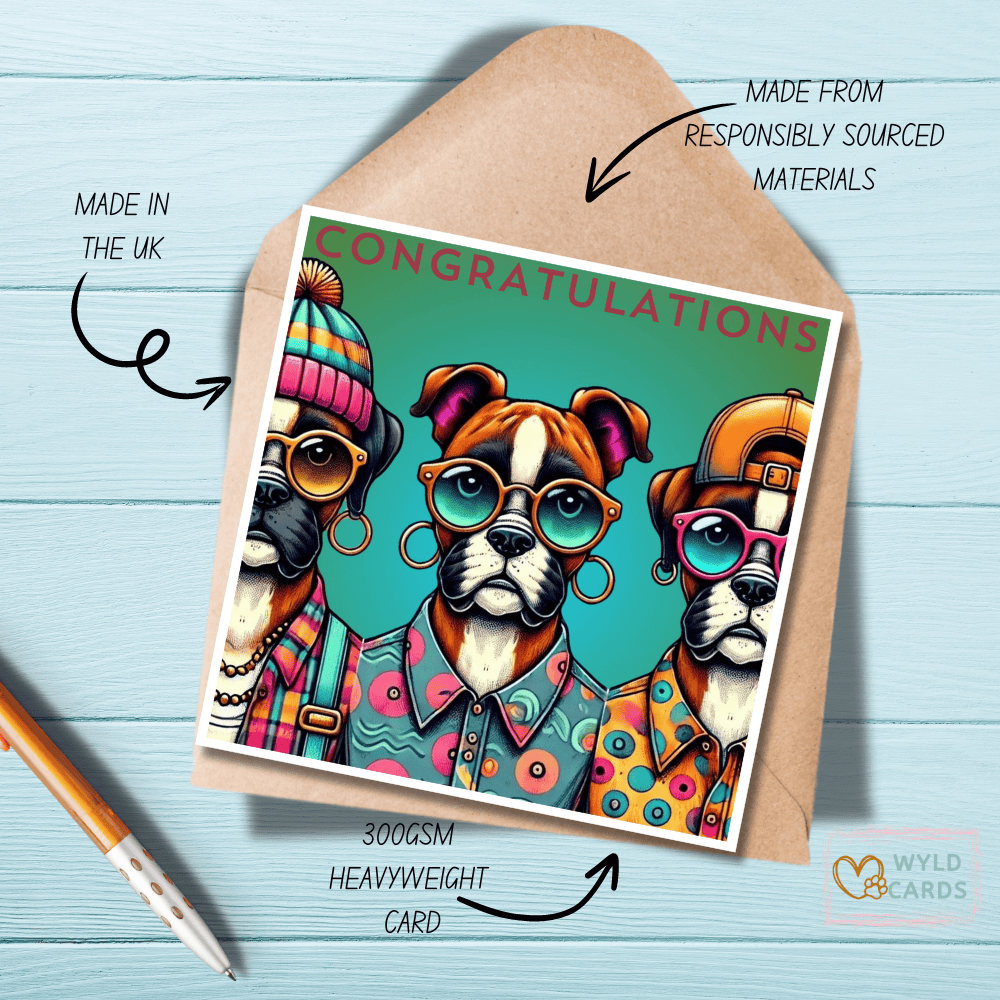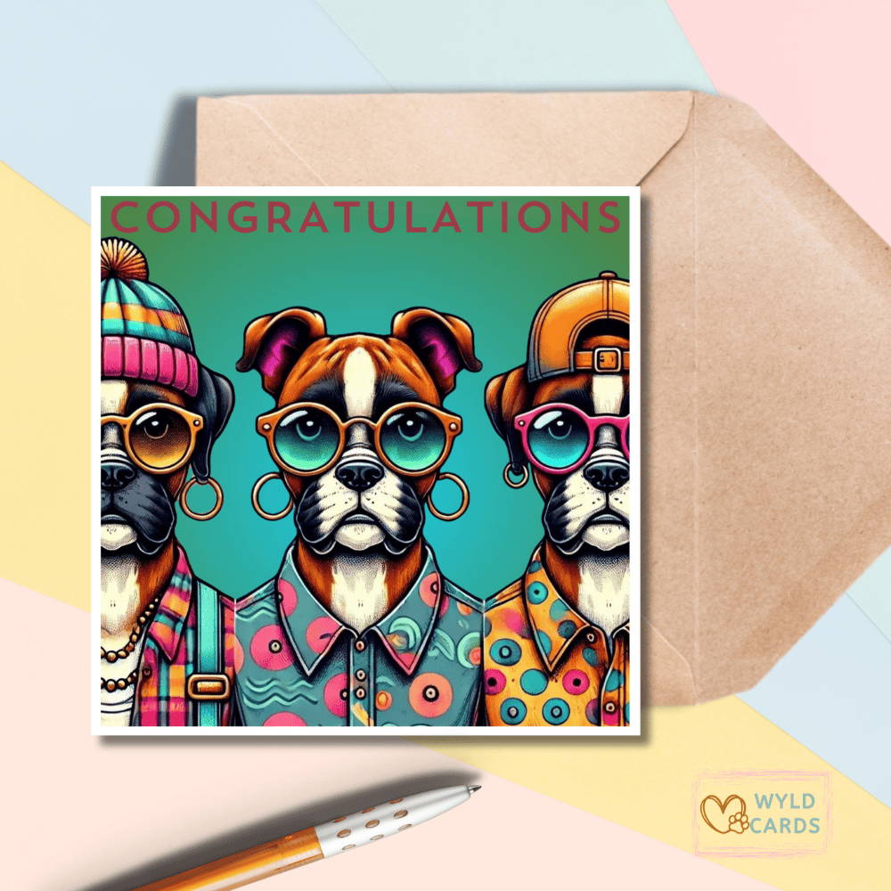 A greetings card with some funky boxer dogs and ‘Congratulations’ on the front, blank inside for you to write your own message.